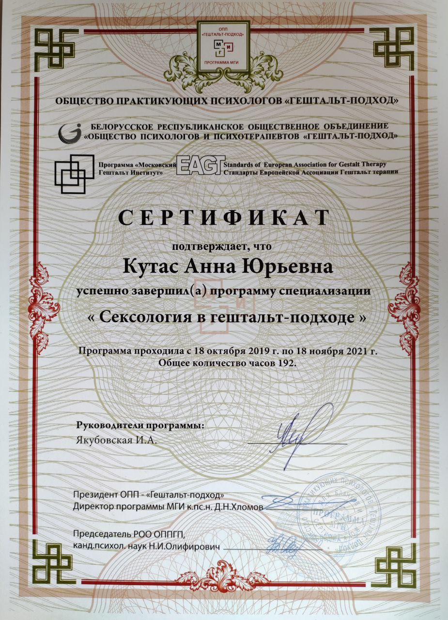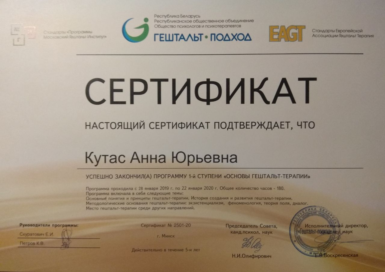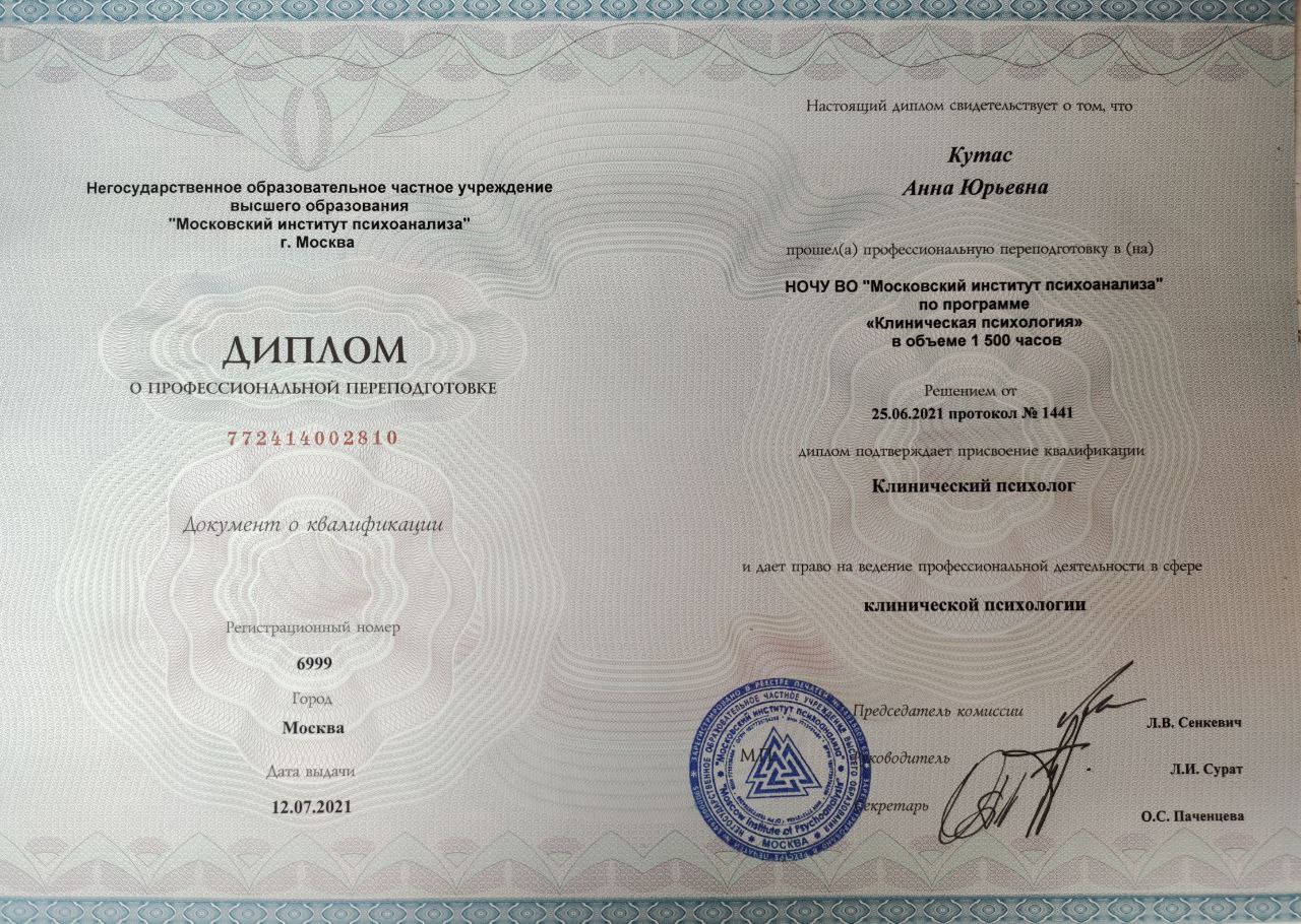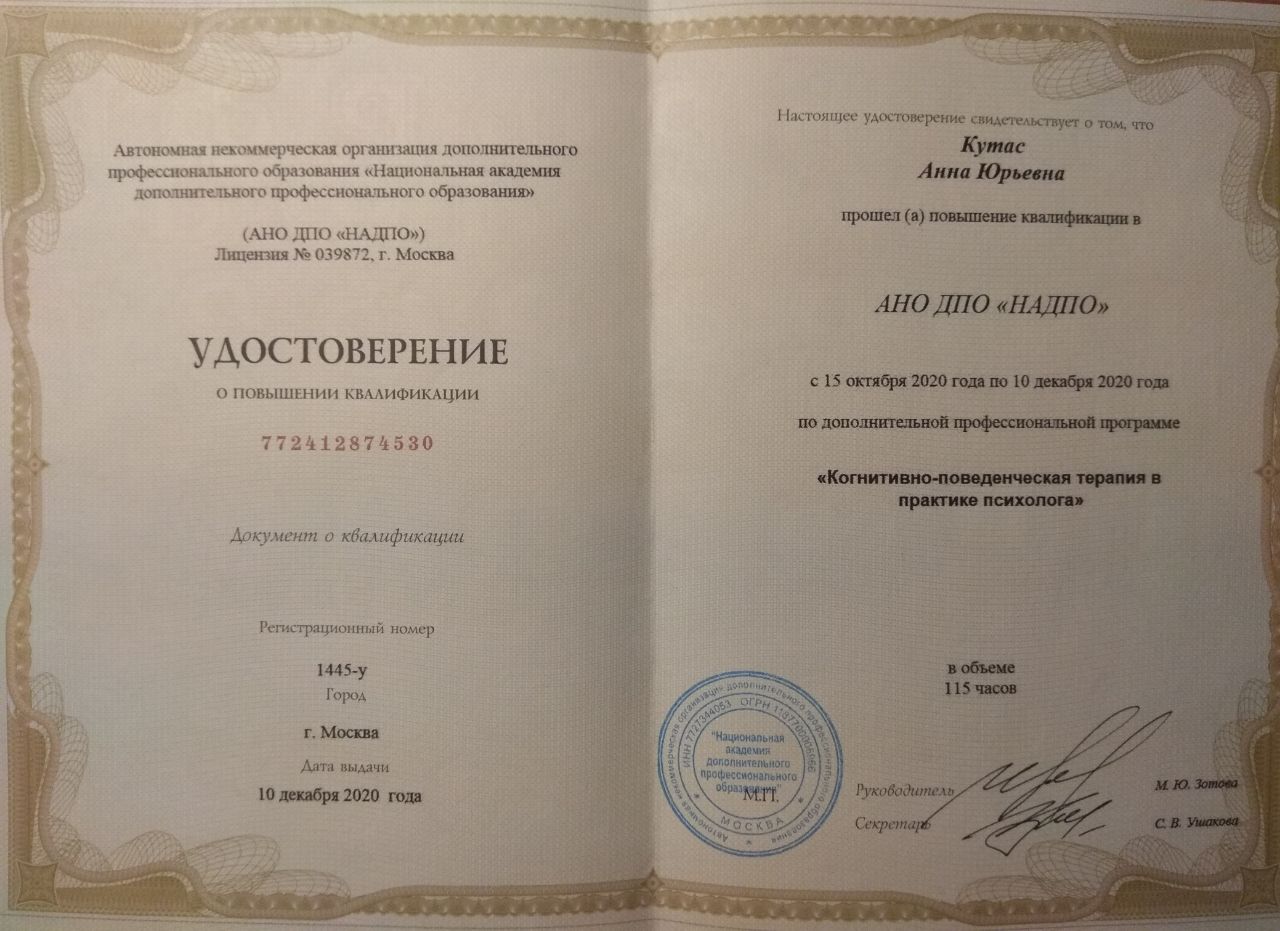 5. Повышение квалификации институт «Иматон»: «Панические атаки. Психотерапия тревожно-депрессивных и панических расстройств»;